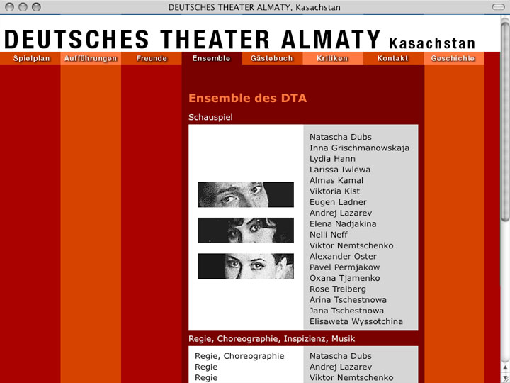 ------------ deutsches theater almati / --------------- internetauftritt theater --------- status: offline --- ------ konzept, design und programmierung: christine zoche -------------------------- -----------------------------------------------------------------------------------